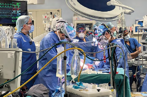 Dr. Rothblatt (center, observing) and the University of Maryland Medical Center surgical team performing the first successful xeno- heart transplant into a living human, Mr. David Bennett.
