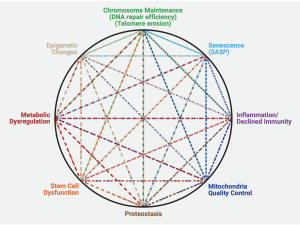 There are up to 12 hallmarks of aging. All of these hallmarks are interconnected. In other words, you don’t have to fix all of them together to be healthier; if you fix one, it improves the others. This is a great opportunity, therapeutically. That is why there has been over $40 billion of investment in longevity biotech companies even during this economic downturn. These companies are choosing one hallmark as a target, and if they can improve it, they can affect other hallmarks and have more indications of how to develop effective drugs.