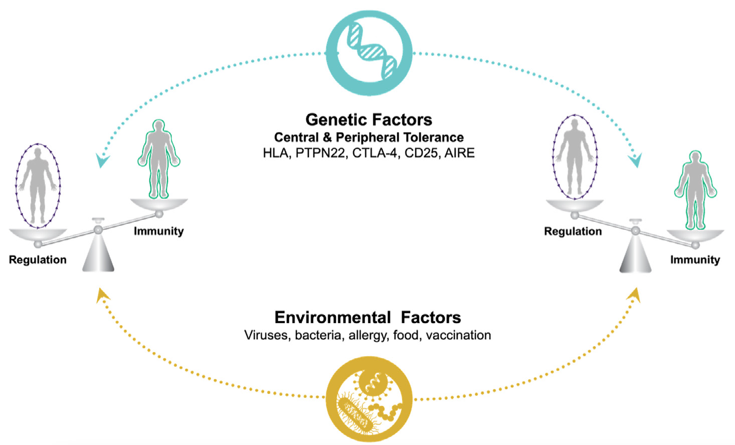 The immune system is engaged in a delicate balancing act, committed to seeking and eliminating infectious pathogens and, at the same time, creating a tolerogenic environment to avoid inadvertent self-reactivity. One example of an immune system gone awry is the consequence of the SARs-CoV-2 infection. The immune system is poised to recognize and destroy the virus, but, often, immune cells start producing factors that cause severe lung inflammation, resulting in COVID-19. Most people die of the consequences of dysregulated immunity rather than the viral infection itself. This Immune regulation graphic (Bucktrout, Bluestone and Ramsdell, 2018) Immune health is a delicate balance between tolerance and immunity dysregulation is likely partly due to the malfunction of Tregs, something seen in various autoimmune diseases.